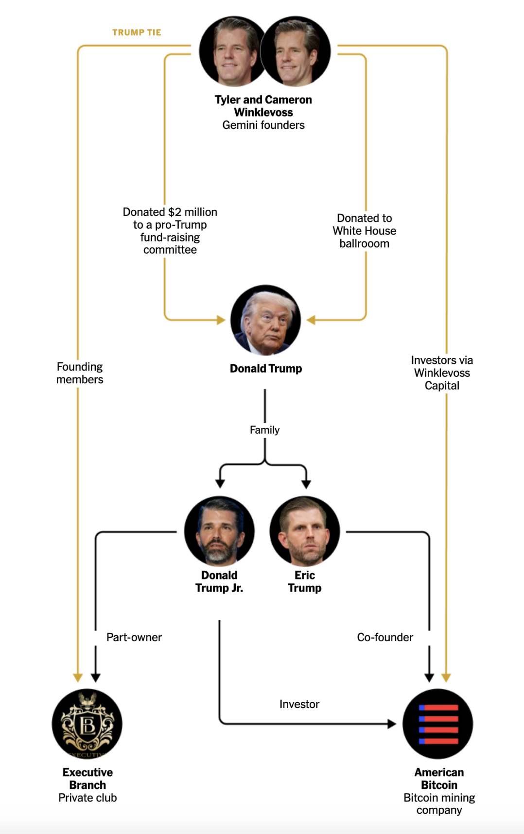 在加密货币行业中,很少有人比 Tyler Winklevoss 和 Cameron Winklevoss 兄弟与特朗普的关系更亲近。这对兄弟创办并运营着加密货币公司 Gemini Trust。他们不仅向支持特朗普连任的筹款委员会及其他共和党相关机构提供资金支持,还出资助力特朗普钟爱的白宫宴会厅翻新项目。此外,他们还为华盛顿一家名为 Executive Branch 的高端私人俱乐部提供了资金支持,特朗普的长子小唐纳德・特朗普正是该俱乐部的股东之一。