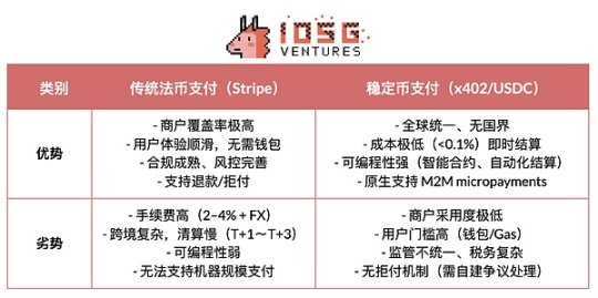在智能体商业(Agentic Commerce)体系中,真实世界的商户网络才是最大的价值场景。无论 AI Agent 如何演进,传统法币支付体系(Stripe、Visa、Mastercard、银行转账)与快速增长的稳定币体系(USDC、x402)都将长期并存,共同构成智能体商业的底座。