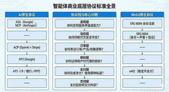 当下智能体商业(Agentic Commerce)的 Web3 生态可分为三层: