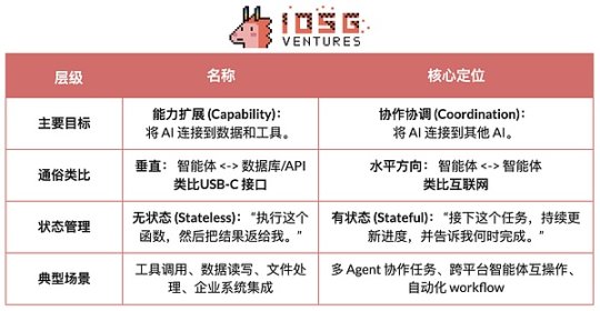 MCP 关注的是 「Agent 如何使用工具」——为模型提供统一且安全的外部资源访问能力(如数据库、API、文件系统等),从而标准化 agent-tool / agent-data 的交互方式。