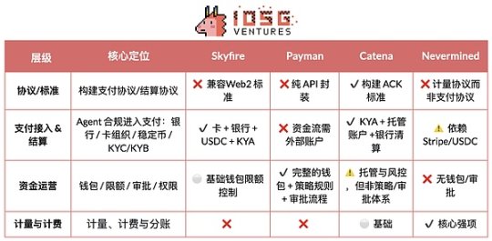 Skyfire、Payman、Catena Labs、Nevermined 属于业务支付层,都需要在不同程度上对接银行、卡组织、PSP 与 KYC/KYB,但它们的真正价值并不在「接入法币」,而在于解决传统金融无法覆盖的机器原生需求——身份映射、权限治理、程序化风控与按次计费。