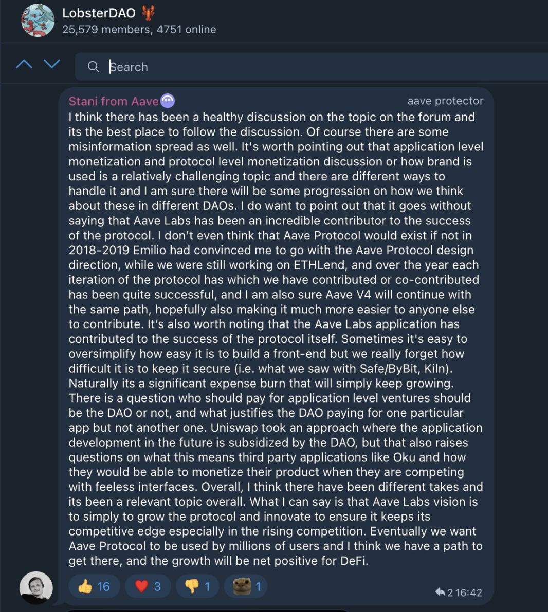 尽管 DAO 模式备受争议,但 Aave DAO 的代币持有者是最活跃和发声的群体,这显示了其社区活力。前端、网站和应用是争议焦点,这里容易出现「各执一词」的情况,缺乏清晰界定。