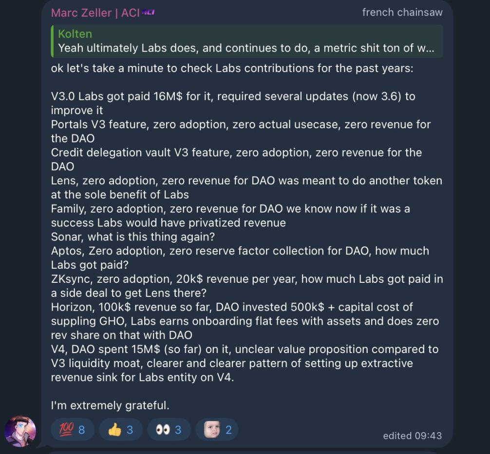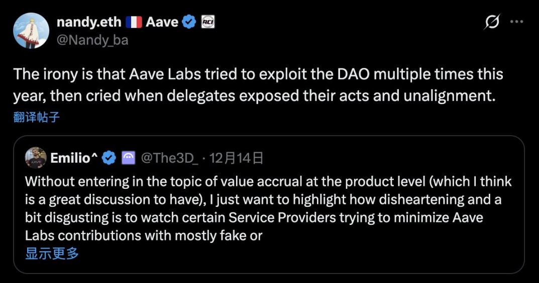 吵架,Emilio 认为有人在恶意贬低 Aave Labs 的贡献和价值。ACI 团队成员则指出 Aave Labs 曾多次试图利用 DAO,并且被揭穿。