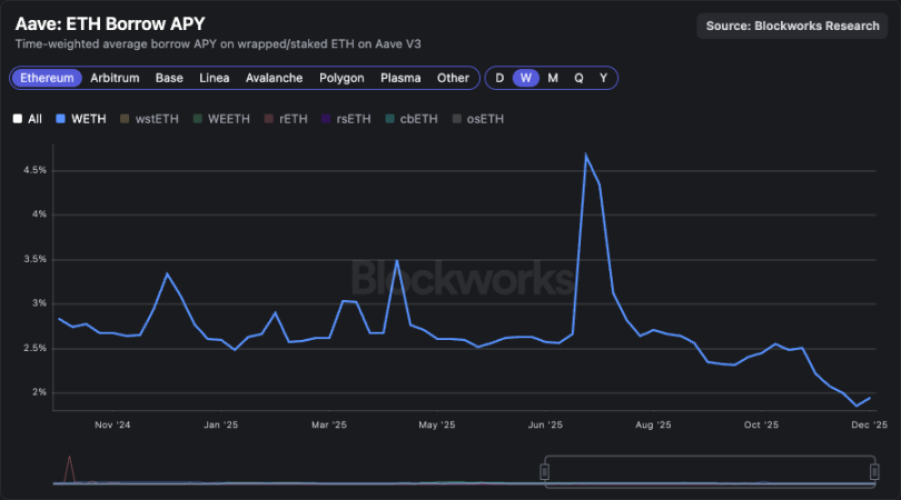 推测为 WETH 借贷利率图表:若利率维持在 2.5% 以下,基差交易可盈利