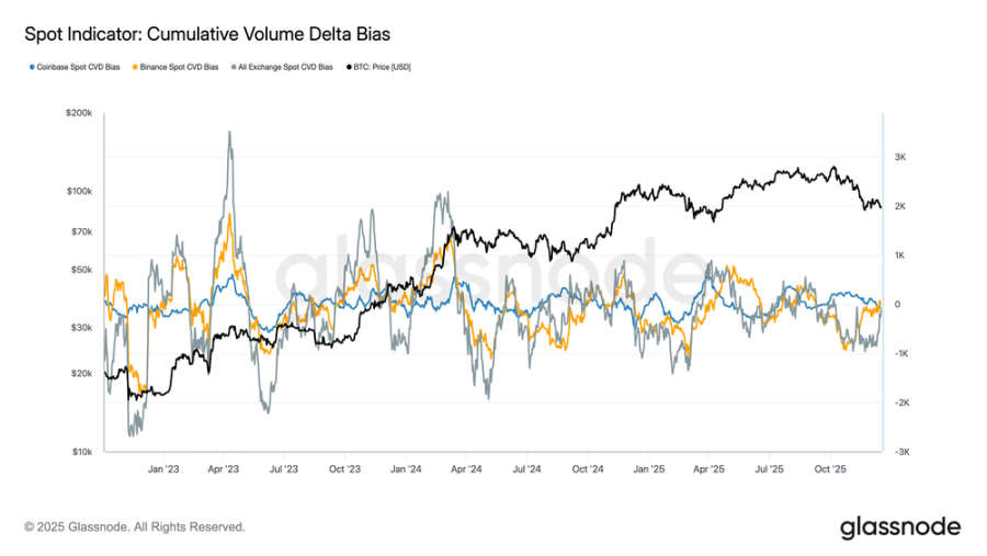 主要交易平台的现货资金流显示需求不均。累计成交量差值显示买盘间歇性爆发,但未能形成持续的积累,尤其在近期回调中。Coinbase 的现货资金流相对积极,显示美国投资者参与更稳定;而币安及汇总数据则波动不定,缺乏方向。