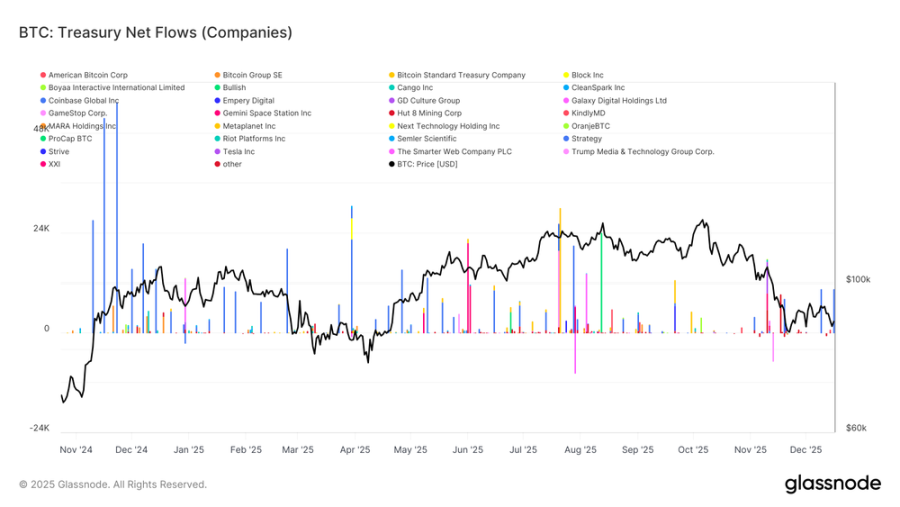 财库公司配置比特币的行为主要由零散的、公司特定事件驱动,而非持续的买入趋势。净流量显示少数公司偶有大额买入,间以长时期的平静,表明企业需求是机会主义的,非系统性的。这些买入往往发生在有利的价格点位或基于战略决策,但尚未形成足以影响市场结构的持续买盘。