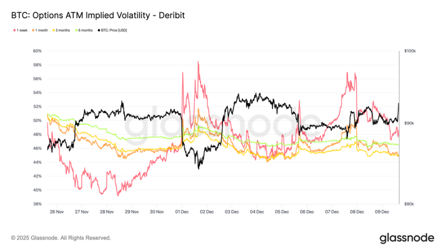 尽管如此,耐心的买盘至今仍坚守在 81,300 美元的真实市场均值附近,避免了更深度的下跌。现货需求零星,企业资金流呈脉冲式,期货市场持续降风险而非重建信心。期权市场强化了区间震荡格局:短期波动率下降,下行风险有定价但稳定,到期日效应将价格走势锁定到 12 月下旬。