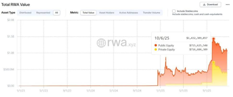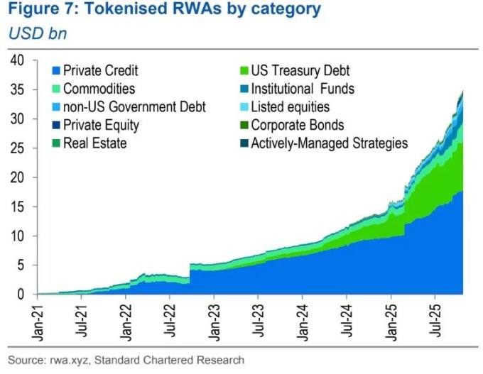 代表股权的 RWA 产品在 2025 年最后一个季度呈现爆发式增长。来源: RWA.xyz