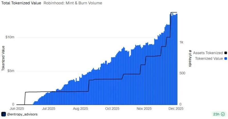 Robinhood 已通证化 1,493 种资产,包括股票和交易所交易产品。来源: Entropy Advisors/Dune Analytics