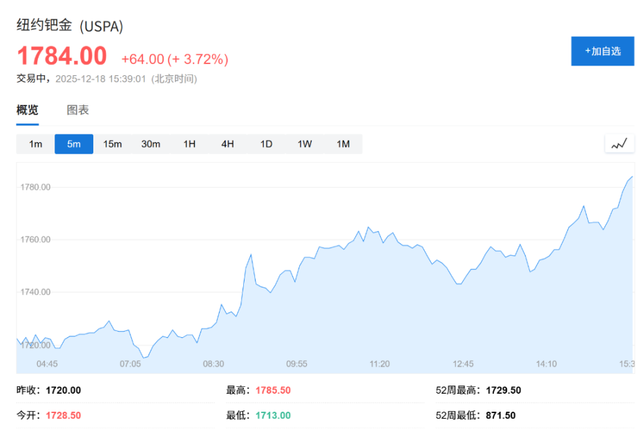 现货钯金突破 1700 美元 / 盎司,为 2023 年 2 月以来首次,日内涨超 3%。