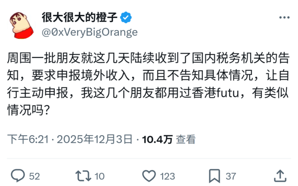 不少境内居民在评论区提到已收到税务机关通过短信、个税 APP 提示或电话等方式发出的提醒,要求尽快开展境外所得自查申报。 从这次互动热潮不难看出,近期税务部门对国内居民的境外投资关注力度正显著加大。类似信号并非偶发:早在 11 月 11 日,北京、广东等六地税务部门就同时曝光 6 起未及时申报境外收入案件。显然这种统一的监管行动绝非偶然,税务机关对个人境外收入的系统性核查将对高热度的 web3 投资活动造成重大影响。