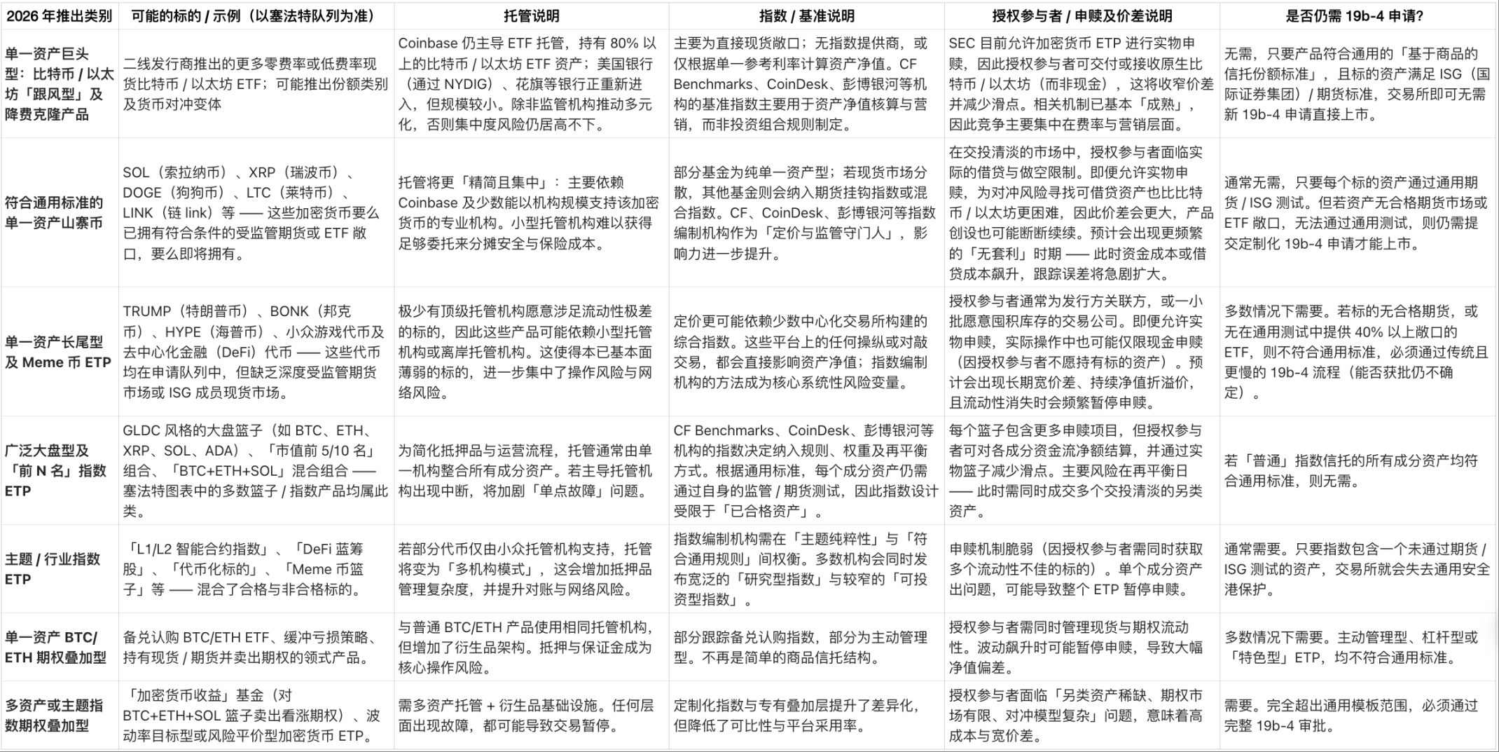 通用标准并未覆盖所有加密货币 ETF 类型 —— 主动管理型、杠杆型、「特色型」ETP 仍需提交单独的 19b-4 申请(如 2 倍杠杆日重置型 ETF,仍需走传统审批流程)。