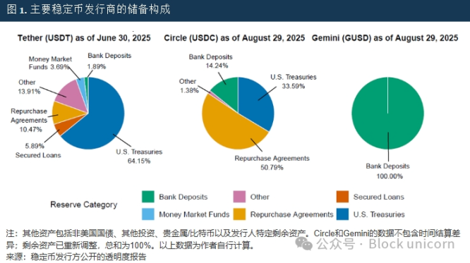 尽管主要的稳定币发行方在其储备金组合中维持着非零的银行存款余额,但各发行方的占比差异很大,从 Circle 的两位数(约 13%)到 Tether 的接近于零,再到 GUSD 仅使用银行存款;参见图 1,这种异质性对于银行存款规模和信贷供给的考量至关重要。发行人的储备金配置也可能在《Genius 法案》实施后以及其他相关法规出台后发生变化。