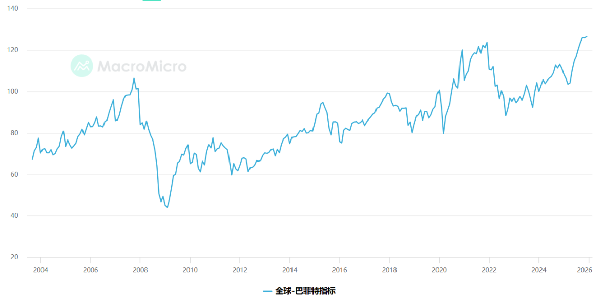 首先,全球股市巴菲特指标(全球股市市值 /GDP)128% 的水准,历史上,2008 年、2015 年、2018 年和 2022 年股市修正前夕都出现过类似信号。这表明全球股市已处于高风险区域。