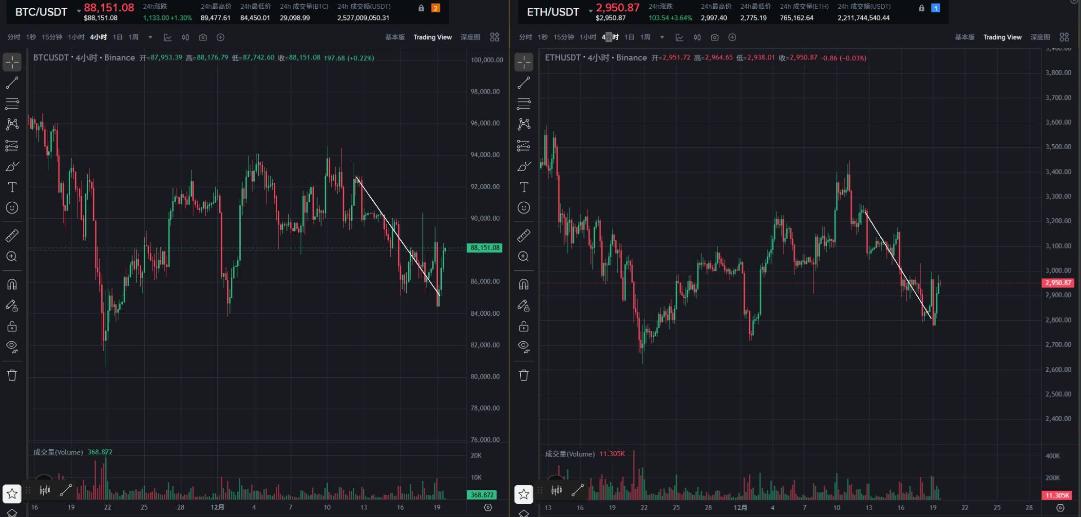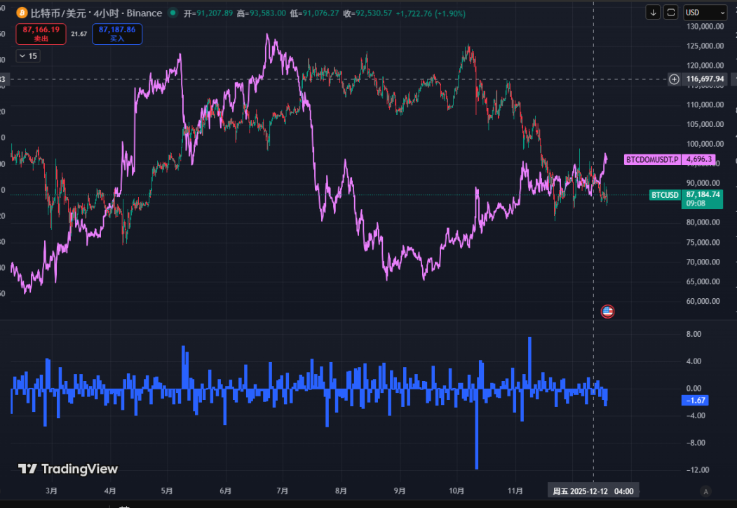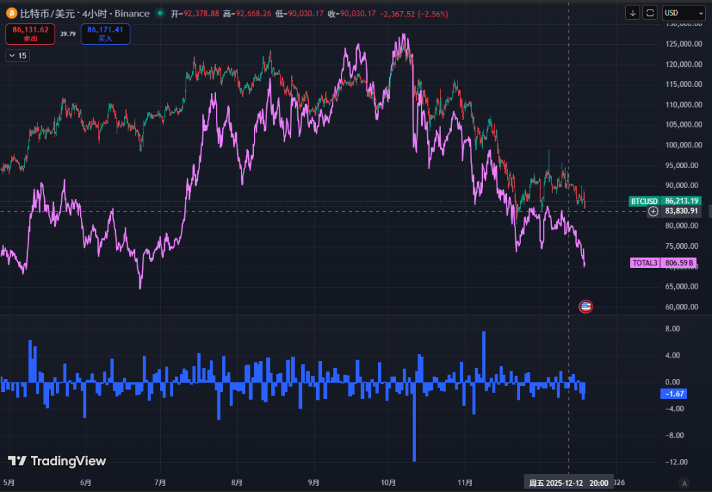 上周我们明确指出,市场处于 “上攻乏力、下跌有限” 的震荡格局。本周行情延续波折走势,94000 美元始终是难以突破的强压力位。自 11 月底开启的反弹,本质属于弱势反弹,这也是我们上周持续建议尝试放空策略的核心逻辑。