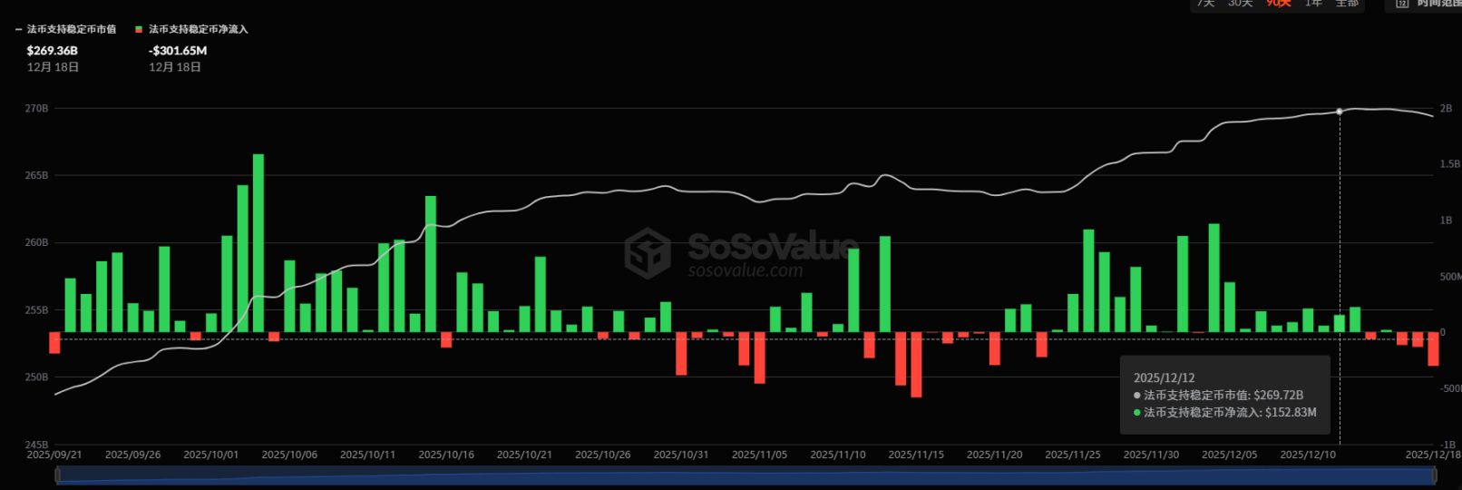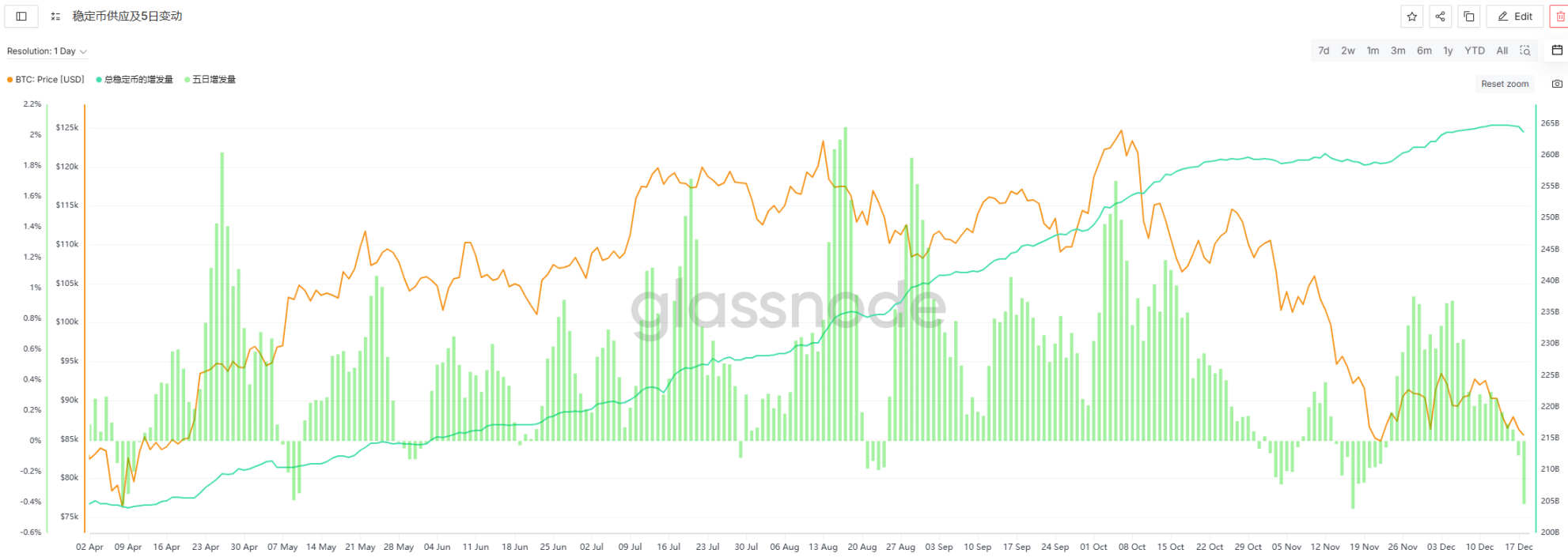 本周(12.13-12.19)稳定币市场资金面进一步收紧,增发速度持续降温。数据显示,单周增发量从上期的 8.6 亿美元转为 **-8.24 亿美元 **(净流出),日均增发量也从 1.23 亿美元降至 -1.177 亿美元,整体环比降幅高达 196%。