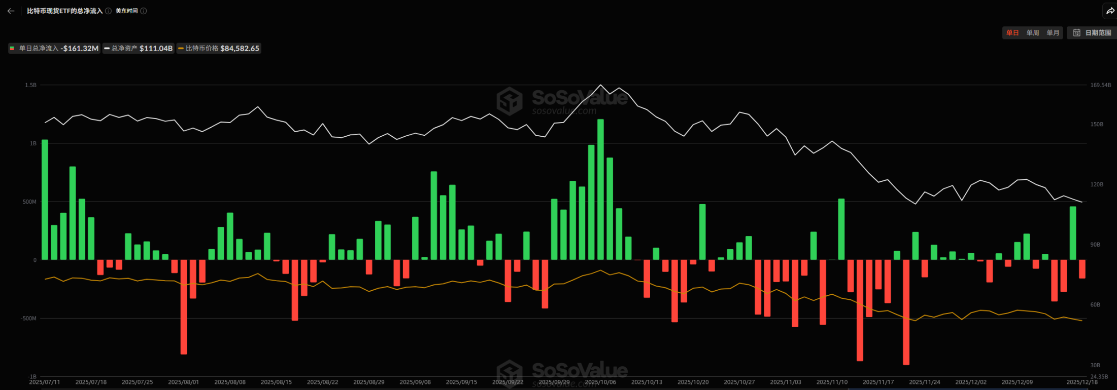 本周比特币 ETF 再次陷入净流出状态,单周净流出金额达 2.8965 亿美元。从单日资金流向柱状图分析,呈现出两个关键特征: