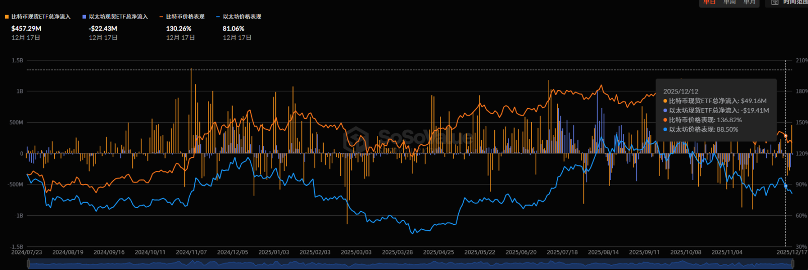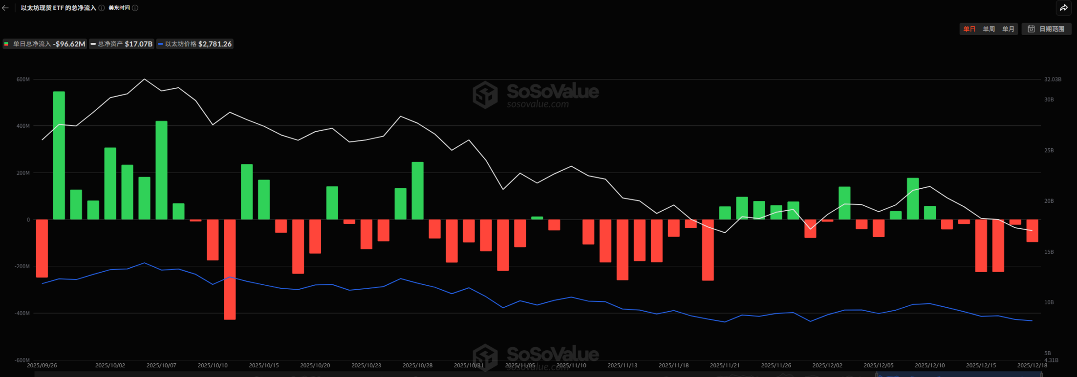 本周以太坊 ETF 净流出规模显著扩大,单周净流出达 5.875 亿美元,远超比特币 ETF 的 2.89 亿美元净流出额。资金面的弱势直接传导至价格,以太坊本周走势明显弱于比特币。从单日资金流向来看,以太坊 ETF 的净流出尚未出现持续收缩的迹象,后续需持续跟踪资金面变化。