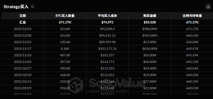 本周市场迎来重要多头信号:微策略于 12 月 15 日斥资 9.8 亿美元,以 92098.4 美元的平均成本,增持 10640 枚比特币。截至目前,微策略持有的比特币总量已达 67.127 万枚,占比特币总供应量的 3.362%,巨头的持续增持为市场提供了底部支撑预期。
