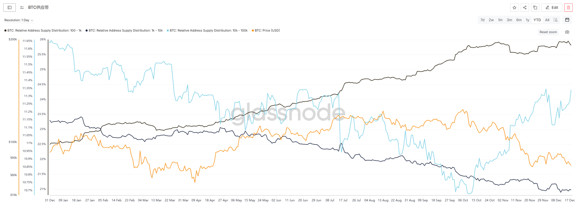 从比特币持币地址结构来看,本周不同规模地址呈现分化态势: