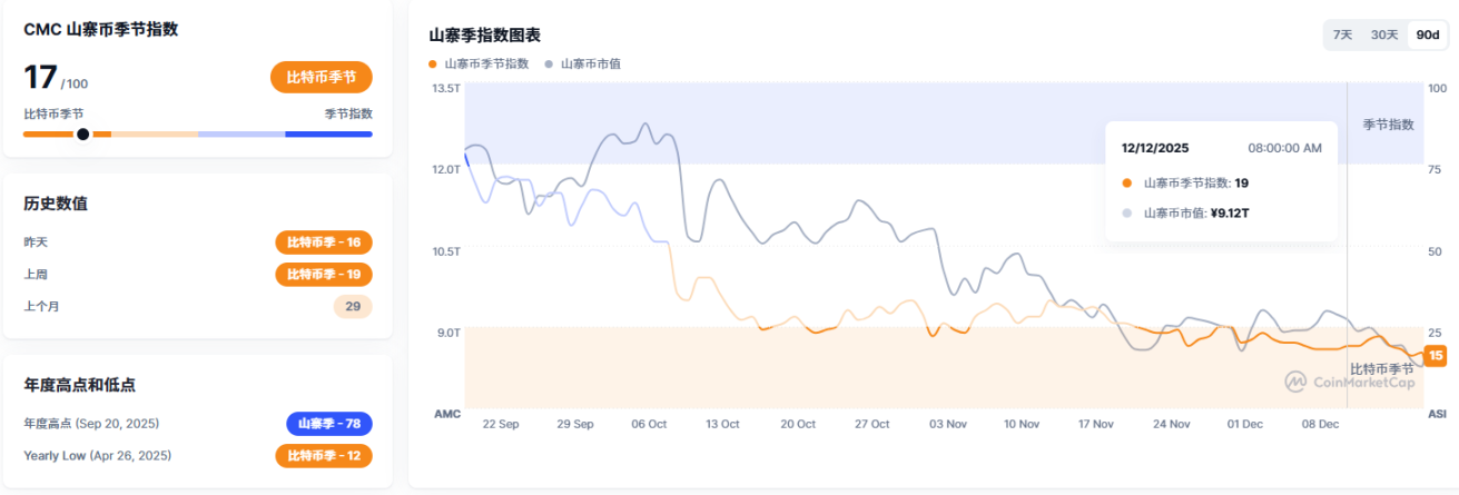 本周五山寨指数报 17,较上周走低,维持低位震荡。相较于比特币,山寨币情绪呈现边际走弱迹象。