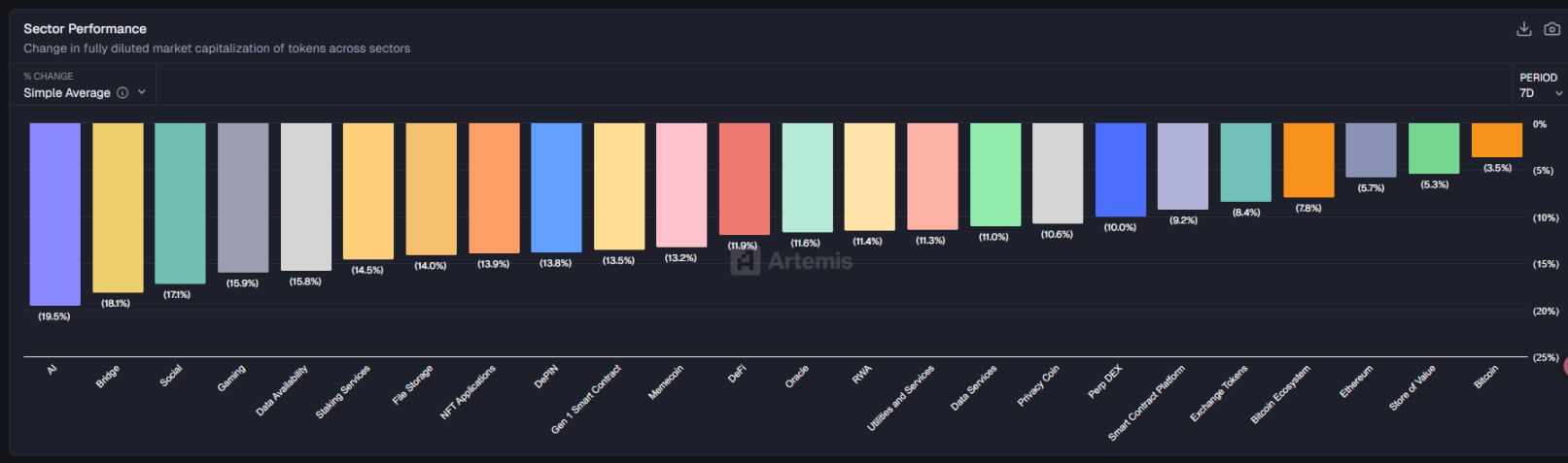 板块表现:按交易所币种板块划分,本周所有板块全线下跌,AI 板块跌幅居前,主流币相对山寨币展现更强抗跌性。