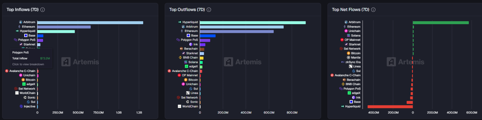 DeFi 桥接资产流向:ARB 链净流入规模居首,Hype 链流出最多。当前市场波动剧烈,高杠杆合约主导的 Hype 链交易难度陡增。