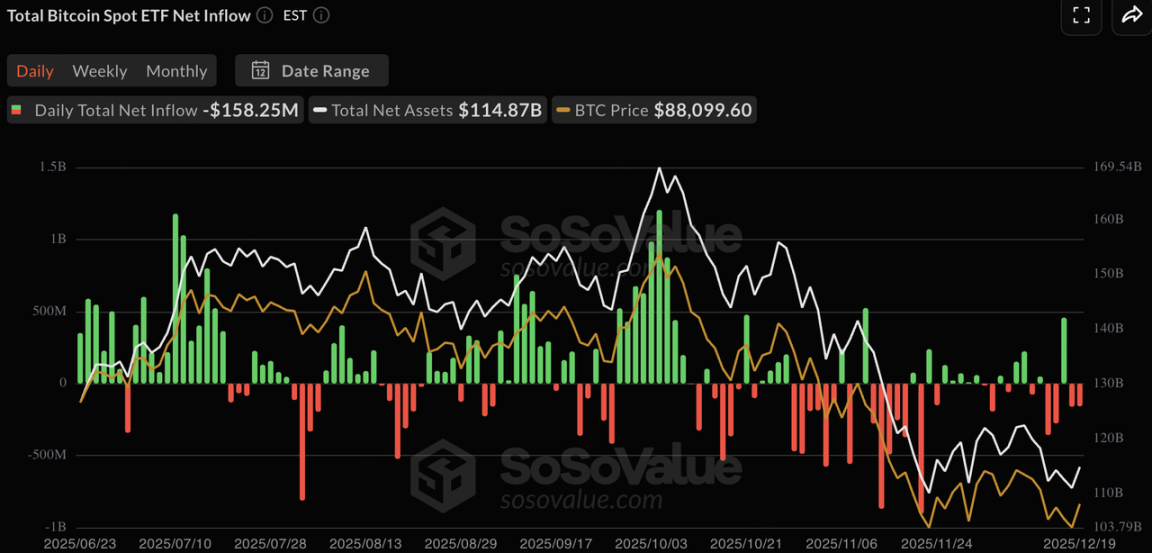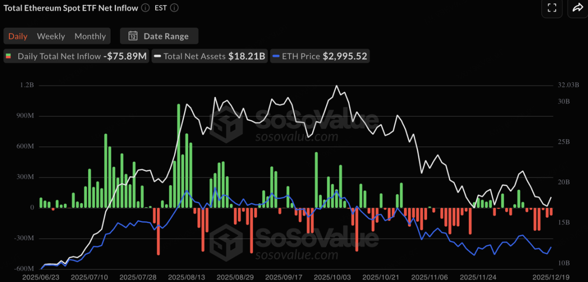 上周,加密现货 ETF 渠道录得了显著的净流出,显示传统机构资金在面对“超级央行周”的不确定性时,优先选择了获利了结并进入圣诞假期的避险模式。BTC 现货 ETF 单周录得净流出约 5 亿美元。这说明在 9 万美元上方的阻力位,机构投资者的观望情绪已占据主导,资金流向从“增量推动”转为“存量博弈”。ETH 现货 ETF 表现更为疲弱,单周净流出高达约 6.4 亿美元。在宏观不确定性(日元加息、美联储鹰派预期)上升时,机构往往会优先削减 “高 Beta、低流动性” 的资产敞口。由于 ETH 在本轮周期中的涨幅和链上叙事相对疲软,导致其在年底的资产配置再平衡中,更容易被视作“防御性减持”的首选,机构正以此换取更充足的现金流或回补美债仓位。
