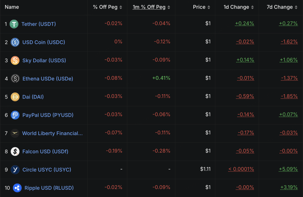 链上流动性方面,稳定币总发行量增速放缓。USDT 仍是主要增量来源,市值达 186.8 亿美元,周涨幅 0.27%,主导份额进一步巩固至 60% 以上;USDC 则小幅回落 1.62%,反映部分资金轮动。 其他币种分化明显:RLUSD 与 USYC 等新兴 / 收益型稳定币录得正增长(分别 +3.19%、+5.09%),而 USDe 与 DAI 继续去杠杆,跌幅 1.37%-1.85%。具体而言,USYC 作为收益型稳定币,直接将短期美债 / 逆回购收益分享给持有者(类似于链上货币市场基金),提供被动收入,同时保持近 1:1 美元锚定和即时兑换 USDC 的流动性,这在年末机构再平衡时特别受欢迎,避免现金闲置。 整体而言,这一温和信号侧面显示资金尚未大规模离开加密市场,等待年后机会。