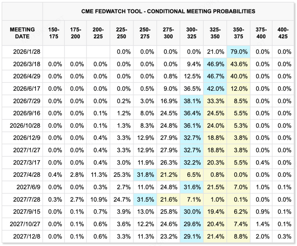 CME FedWatch Tool 显示,市场判断,美联储 1 月会议维持当前利率的概率高达 79%。到 3 月 /4 月会议,市场对降息的隐含概率仍不高,暂时没有显著定价累计 50bp 降息。全年降息幅度中枢指向 25-50bp。FedWatch 的这一价格路径反映了市场对通胀走势与经济增长前景的持续消化。