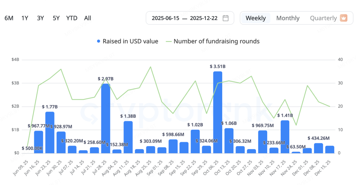 本周一级资金偏好继续向“基础设施 + 实际落地”倾斜,支付、DePIN、数据与 AI 相关项目成为热点。DePIN 赛道和 Payfi 赛道尤为活跃。Fuse(能源网络)、DAWN(去中心化 AI 计算)、ETHGAS(以太坊 Gas 抽象)、Speed(比特币计算层)等多个项目密集披露融资,反映投资者对“链上资源映射现实世界生产力”叙事的持续看好。年末效应下,周期较晚的轮次(B 轮及以后)与战略并购占比提升,资金更注重现金流潜力,而非单纯早期高风险博弈。