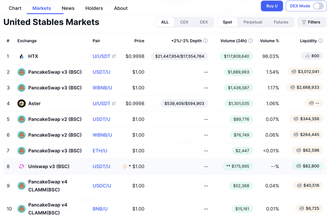 从链上结果看,$U 上线后供应扩张速度较快:在上线不足 4 天内,BscScan 显示最大总供应量已达约 1.599 亿枚、持币地址约 7,614 个。与此同时,$U 当前 Top holders 中 HTX 相关地址占比超过 65%,且 HTX 提供高达 20% 的年化理财活动。在“上线初期快速做大规模”的叙事里,这类集中度并不罕见:既可能来自早期机构铸造与托管 / 做市安排,也可能来自 CEX 侧的流动性与理财活动对筹码的吸附。但对外部观察者而言,集中度客观上会放大两类担忧:一是二级流动性与价格发现是否足够分散;二是赎回与储备透明度在极端情境下的可验证性。