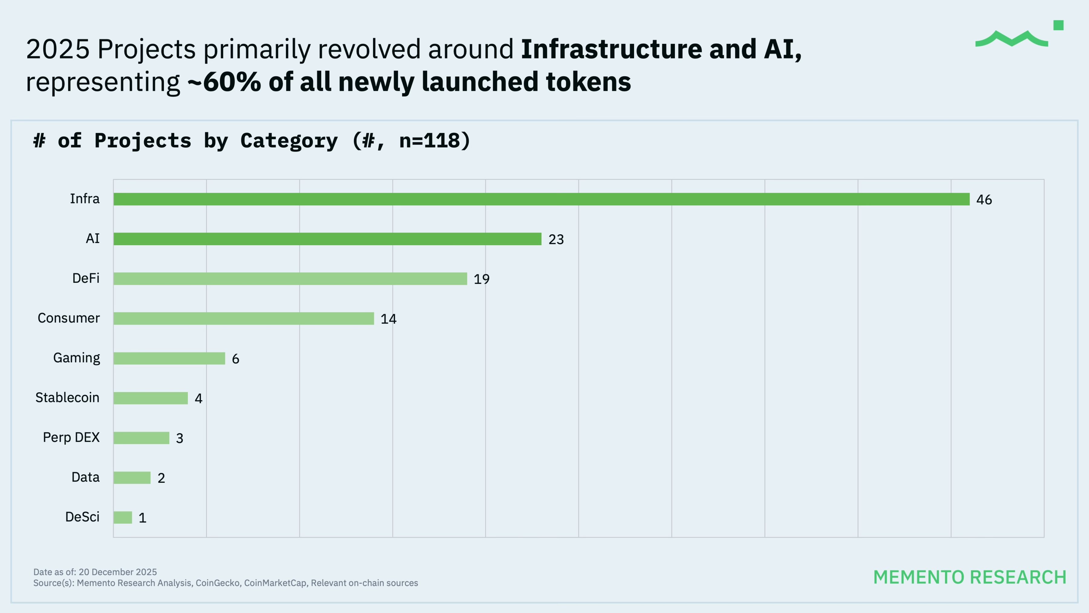 2025 年的代币发行项目主要集中在两大领域 —— 基础设施(Infra)和人工智能(AI),这两类项目占所有新发行代币的 60%。不过,各品类项目的平均回报率与中位数回报率差异显著,值得关注。