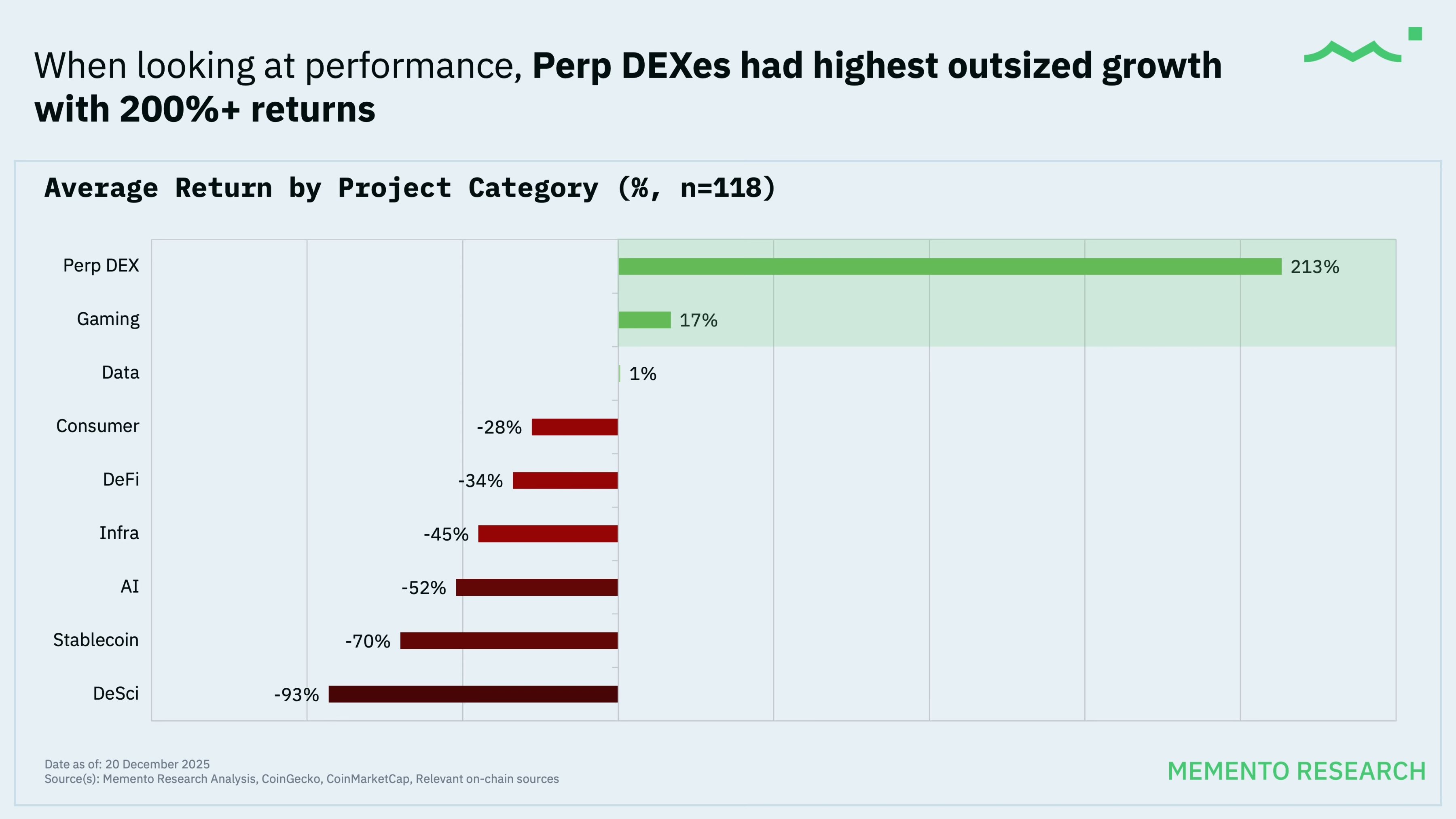 • 2025 年的行业主线是永续合约去中心化交易所(Perp DEX)的崛起,以 Hyperliquid 为代表,第四季度 Aster 也顺利上线。尽管该品类样本量较小且中位数仍为负值,但永续合约去中心化交易所(平均涨幅 213%)堪称「独一档的赢家」;