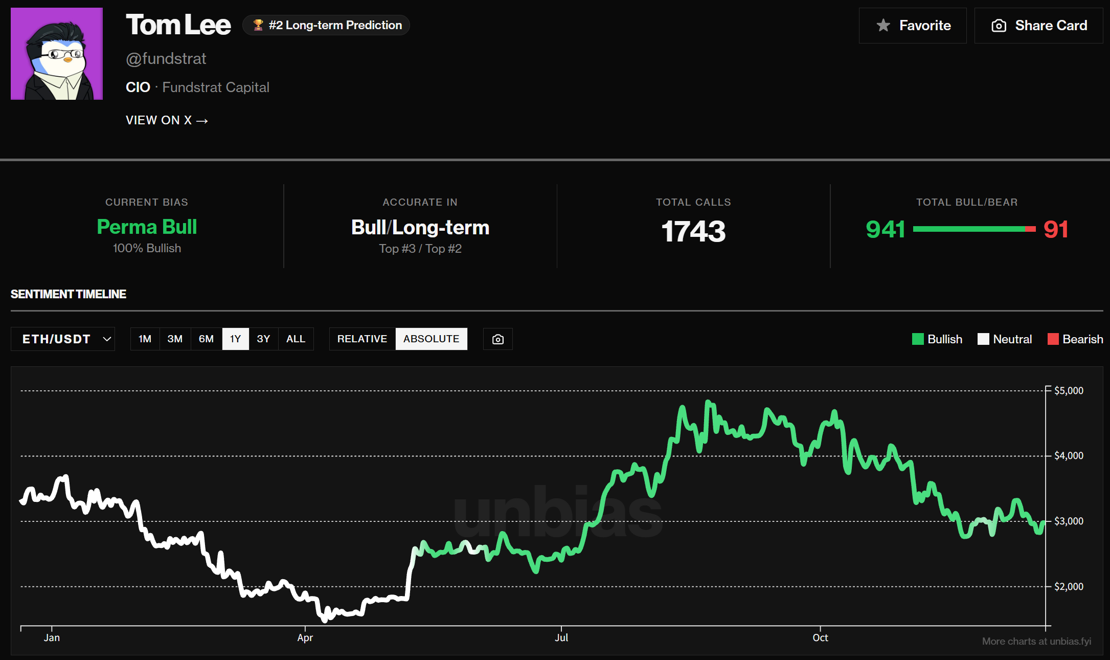 如果要为 2025 年以太坊多头叙事选一个最具代表性的人物,以太坊财库公司 BitMine 董事长、Fundstrat 联合创始人兼首席投资官 Tom Lee 往往会被放在最显眼的位置。他在多次公开发言中反复强调 ETH 被低估,在不久前 12 月 4 日的币安区块链周也称 3000 美元的以太坊被“严重低估”,并曾给出“2025 年底 ETH 1.5 万美元”的高目标价判断。作为华尔街出身、有“华尔街神算子”之称、长期活跃于媒体与机构路演的策略人士,Tom Lee 的观点常被市场视作情绪风向标。