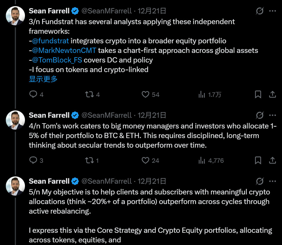表示 Fundstrat 内部有多位分析师,各自采用独立的研究框架与时间尺度,以服务不同类型客户的目标;其中 Tom Lee 的研究更面向传统资产管理机构与“低比例配置”投资者(通常仅将 1%–5% 资产配置至 BTC/ETH),强调长期纪律与结构性趋势,而其本人则主要服务加密资产占比较高的组合(约 20%+)。但是 Tom Lee 本人在公开喊多 ETH 时并未声明自己是面向 “1%–5% 资产配置至 BTC/ETH” 的群体。