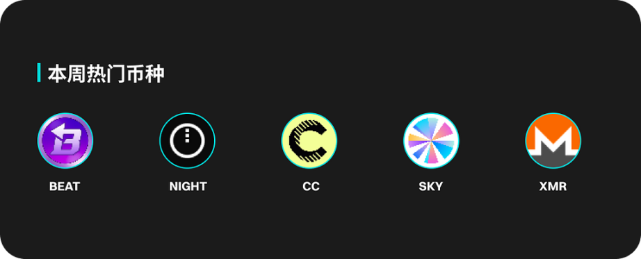 热门币种方面,BEAT、NIGHT、CC、SKY 和 XMR 都有着不俗的表现,涨幅百分比位列前五。 BEAT 本周价格上涨 61.14%。NIGHT 价格上涨 55.61%。CC 价格上涨 24.03%。SKY 和 XMR 本周分别上涨 17.32% 和 15.13%。