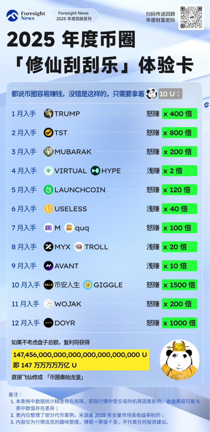 从情绪面来说,2025 年对于加密货币的散户玩家来说并不友好;于是我们在回顾这一年轮动板块与热门叙事时,进行了一次幻想:如果我是一名「10u 战神」,带着微薄的启动资金,像电影里的主角一样踩中每一个热点,一年过去,我的身价能否比肩《西虹市首富》中的王多鱼呢?