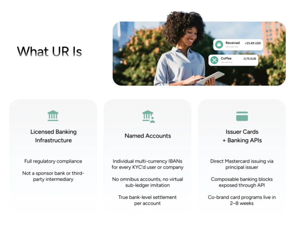 UR 是受瑞士金融监管的持牌平台,为用户提供统一的数字资产和传统货币账户管理服务。每位完成身份验证的用户获得独立的多币种 IBAN,支持零手续费资金转换、低成本外汇兑换,以及开发者 Banking API。