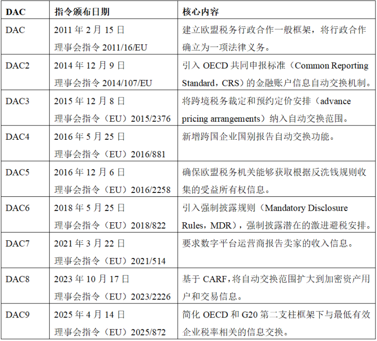 欧盟于 2011 年开始颁布 DAC 系列指令。DAC 本身并不涉及税款征缴,而是建立了一个协调的框架,允许欧盟成员国之间收集并交换与个人和公司相关的税务信息,以满足欧盟各国在税收领域相互援助的需求,并确保各国家税务机关之间的行政合作。