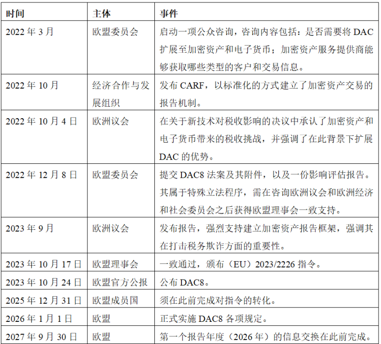 欧盟层面,DAC8 的缘起可追溯至 2022 年,其制定与实施的相关事件时间线如下表所示:
