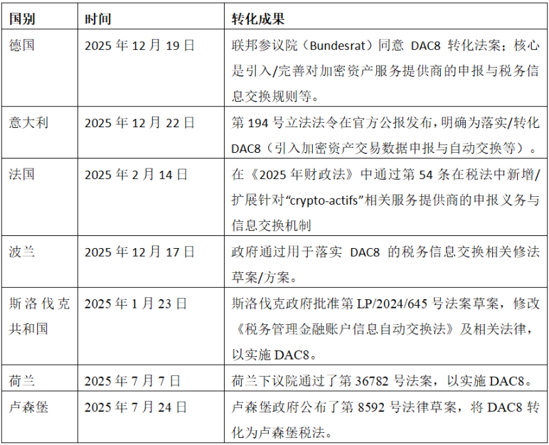 DAC8 为欧盟成员国设置过渡期,要求欧盟各成员国在 2025 年 12 月 31 日之前完成对 DAC8 的转化,部分成员国的转化成果如下: