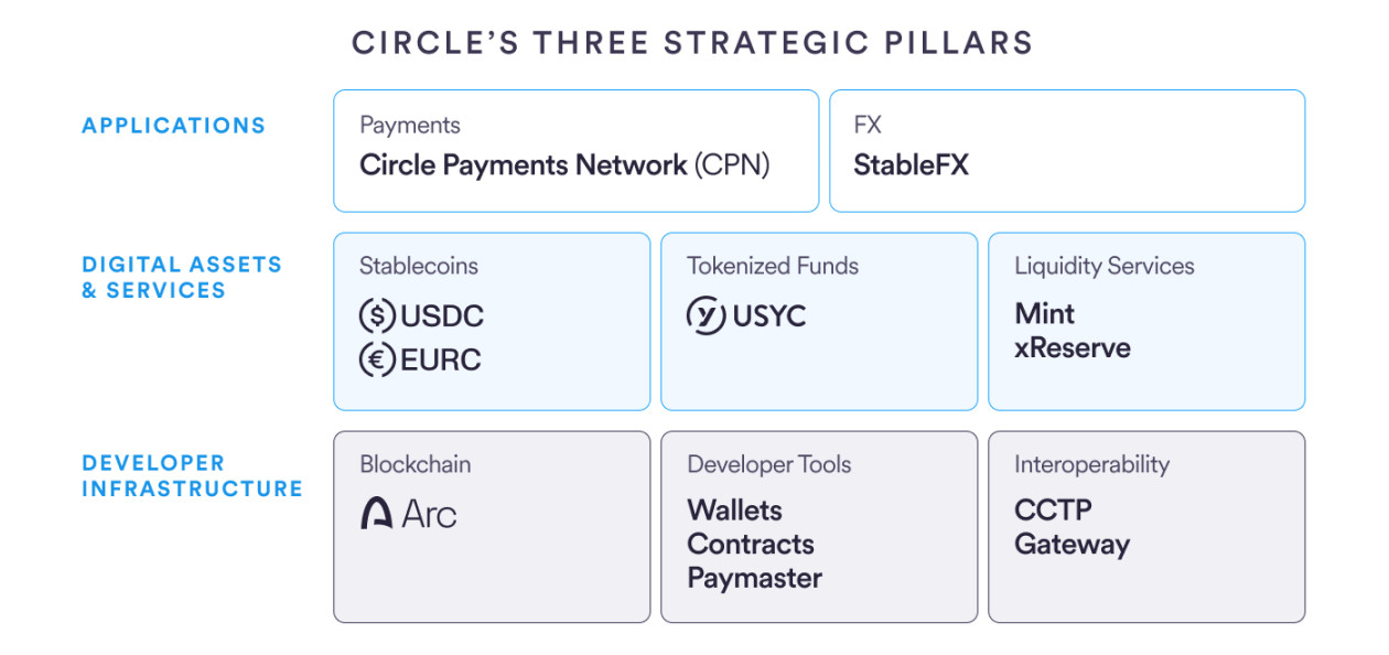 我们的战略依托三大协同支柱,2025 年持续推进:一是全额储备的数字稳定币(USDC、EURC 和 USYC);二是应用服务矩阵(含 Circle Payments Network、StableFX);三是推出 Arc 区块链,融合可编程货币与现实经济活动,打造中立机构级基础设施。三者构成全栈技术平台,推动可编程货币与链上交易跻身全球金融主流。