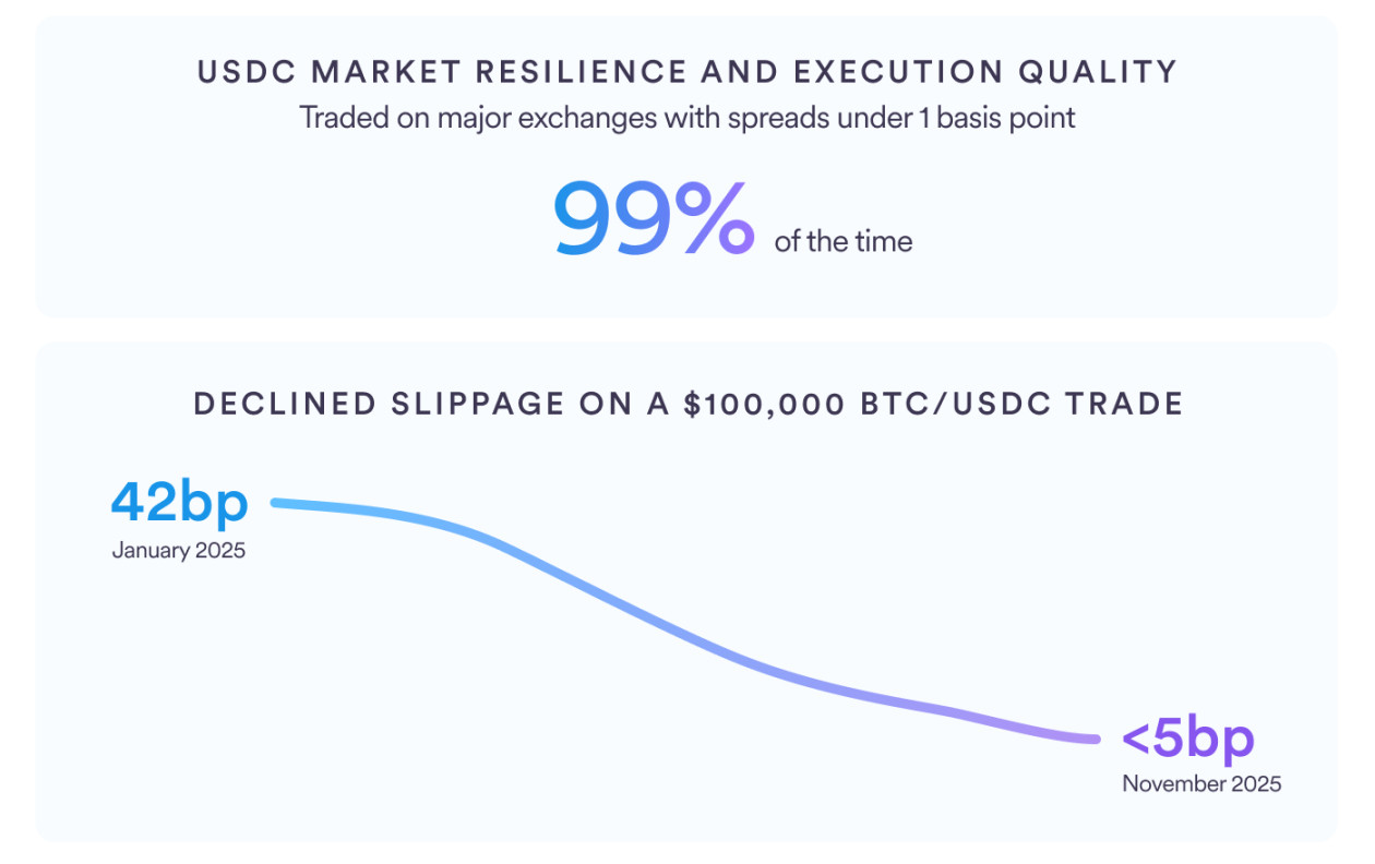 市场流动性在过去一年显著提升,币安 BTC/USDC 现货流动性增长 227%,永续合约深度提升超 200%。交易指标优化,99% 时间点差低于 1 基点,10 万美元交易滑点从 42 基点降至不足 5 基点,逐步缩小与 USDT 差距,成为高可信度流动性载体。