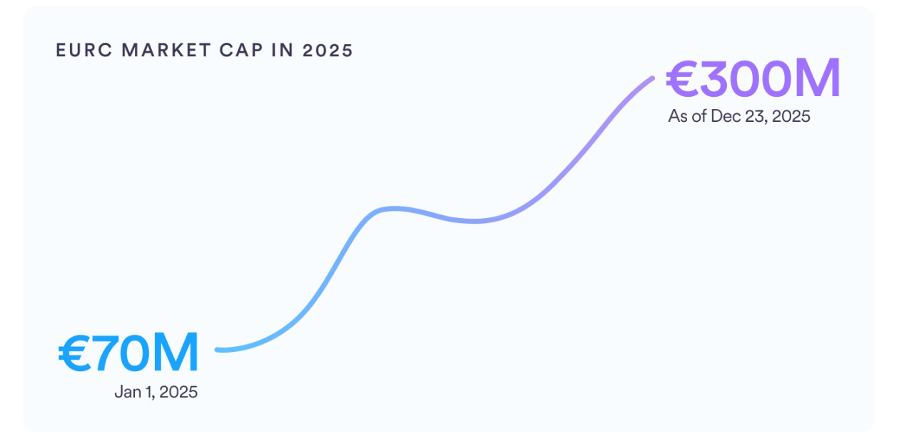 2025 年对 EURC 而言也是至关重要的一年。MiCA 落地驱动 EURC 爆发式增长,截至 12 月 23 日市值从 7000 万欧元升至超 3 亿欧元,增长 328%,稳居欧元稳定币榜首。