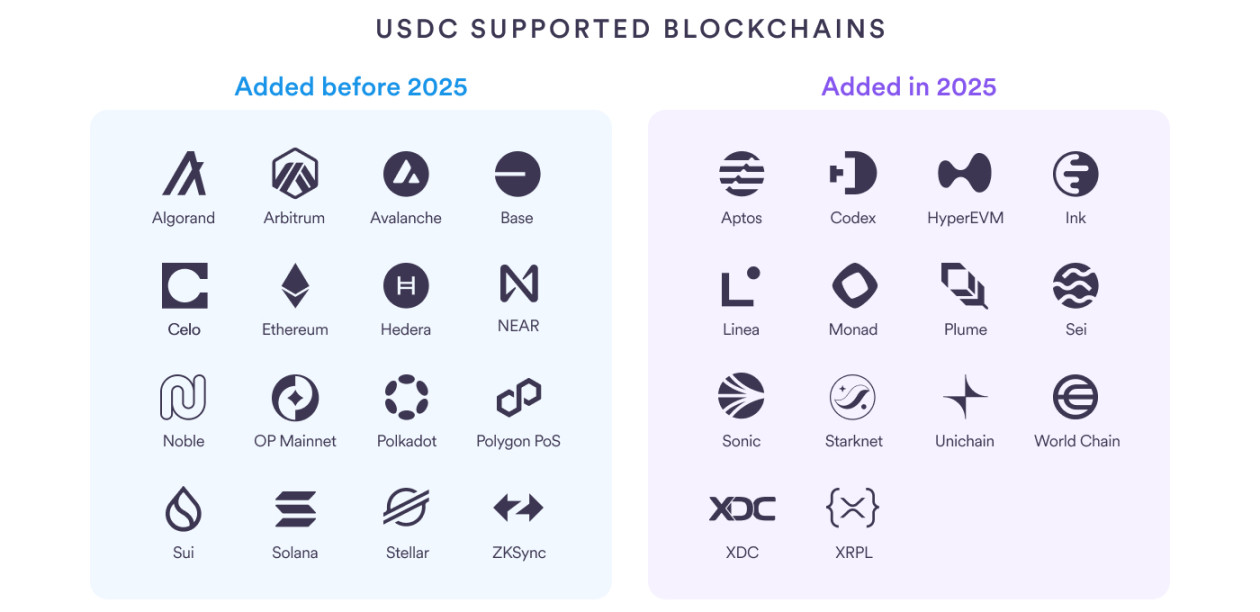 截至 2025 年 12 月 23 日,USDC 市值从 440 亿美元升至 770 亿美元,增长 75%。链上覆盖拓展至 30 条区块链,新增 XRP Ledger 等 14 条公链。CCTP 协议升级后支持 17 条链跨链转移,累计交易额超 1260 亿美元、转账超 600 万笔。