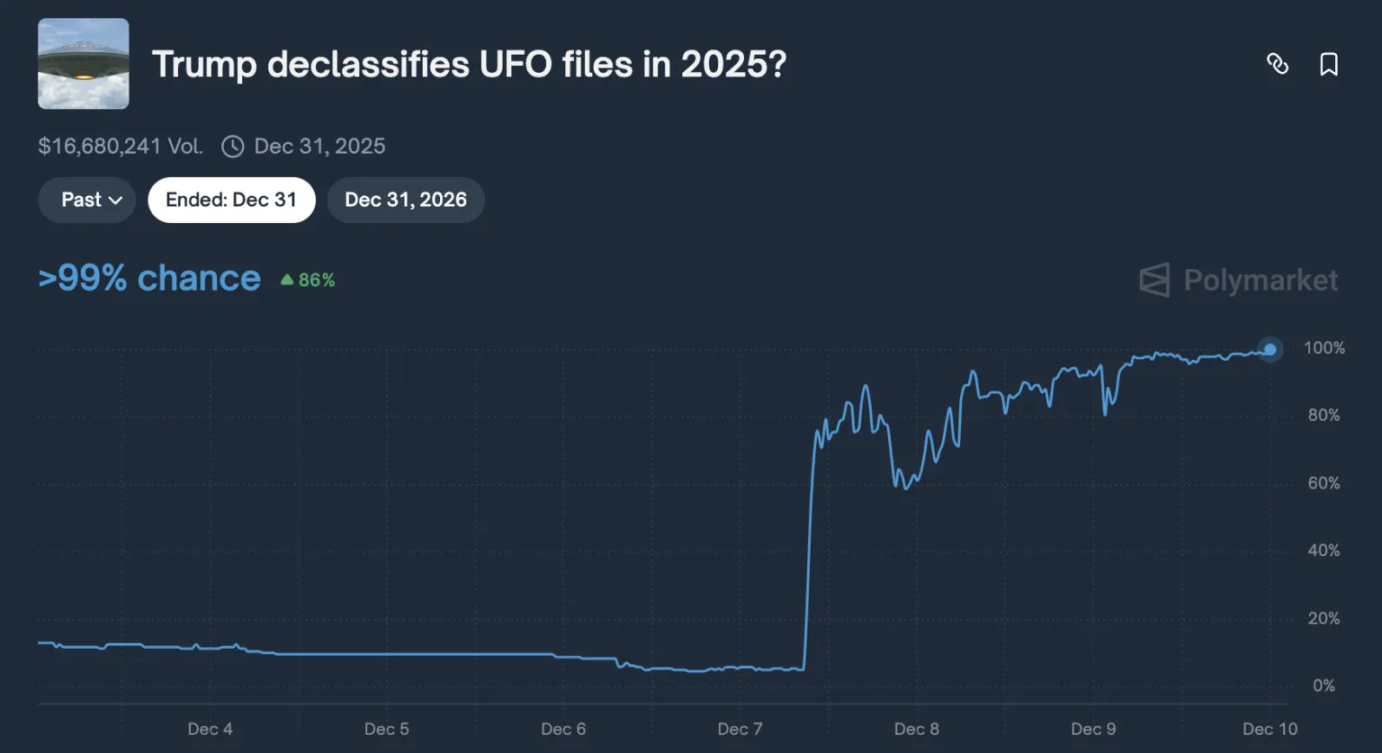 理论上的风险已经在 2025 年转化为血淋淋的现实。UFO 文件解密市场的崩盘就是一个典型案例。这个市场于 2025 年 4 月创建,询问特朗普政府是否会在 2025 年解密 UFO 文件,交易量达到 1600 万美元,吸引了大量投机者。操纵过程分为几个精心设计的步骤:鲸鱼首先在结算前以接近面值的价格买入"YES"股份,然后利用 Polymarket 依赖的 UMA 预言机系统发起攻击。