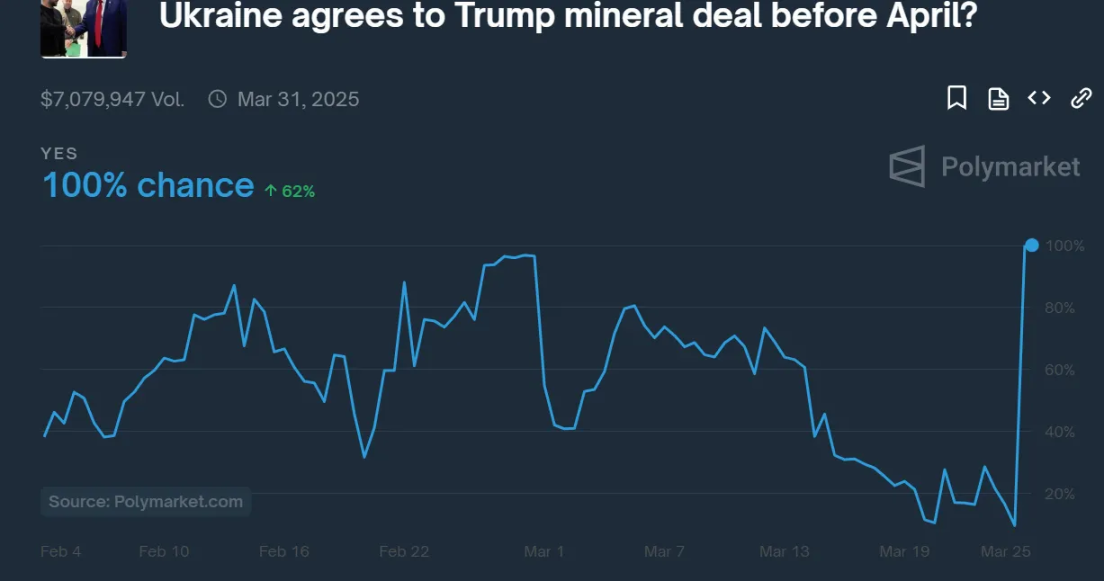 三个月前的乌克兰矿产协议市场遭遇了更加露骨的治理攻击。这个市场询问乌克兰是否会在 4 月前与特朗普政府签署矿产协议,总赌注超过 700 万美元。鲸鱼通过三个地址控制了 500 万 UMA 代币,约占总量的 25%,价值约 2000 万美元。在投票窗口的最后时刻,这三个地址同时投票支持"YES"。尽管实际上没有任何矿产协议签署,市场被强制结算为"YES"。