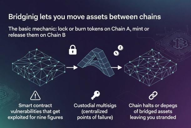 跨链桥实现了资产在不同区块链间的转移。基本原理是:在 A 链锁定或销毁代币,在 B 链铸造或释放等量代币。概念简单,但风险复杂。