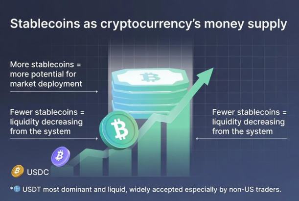 稳定币供应量相当于加密世界的广义货币供应量(M2)。